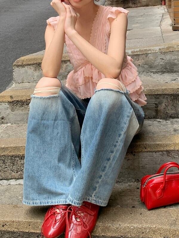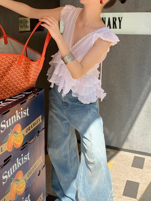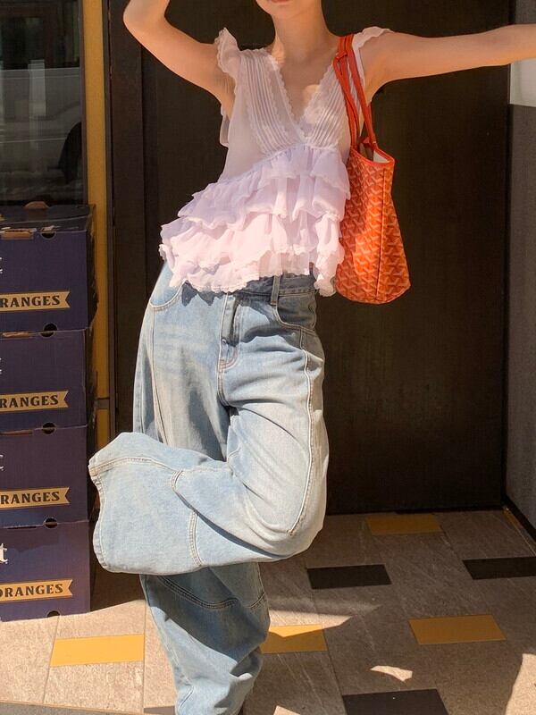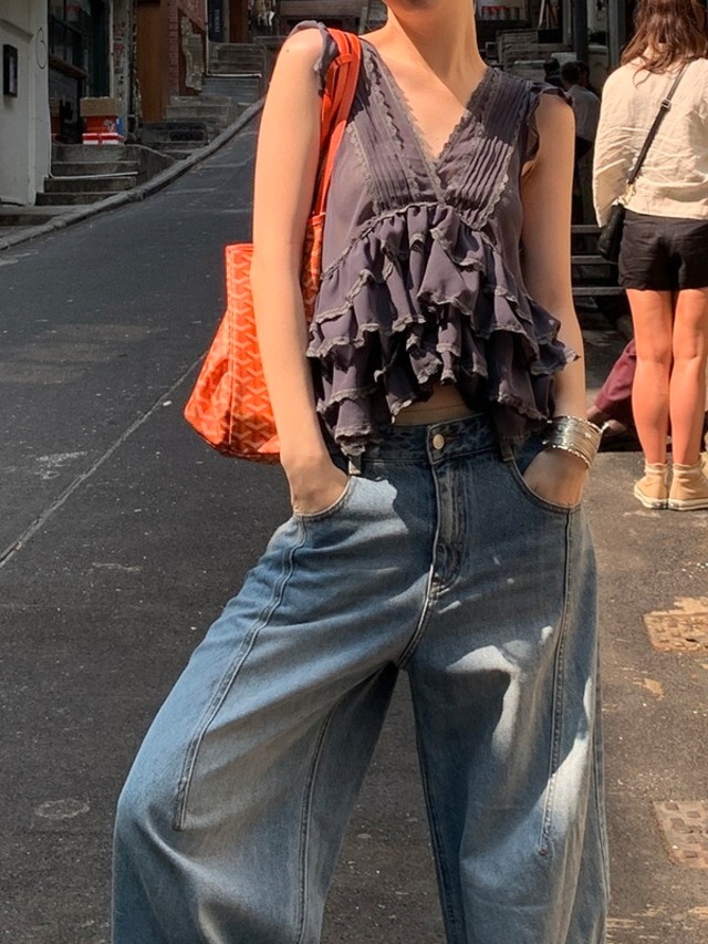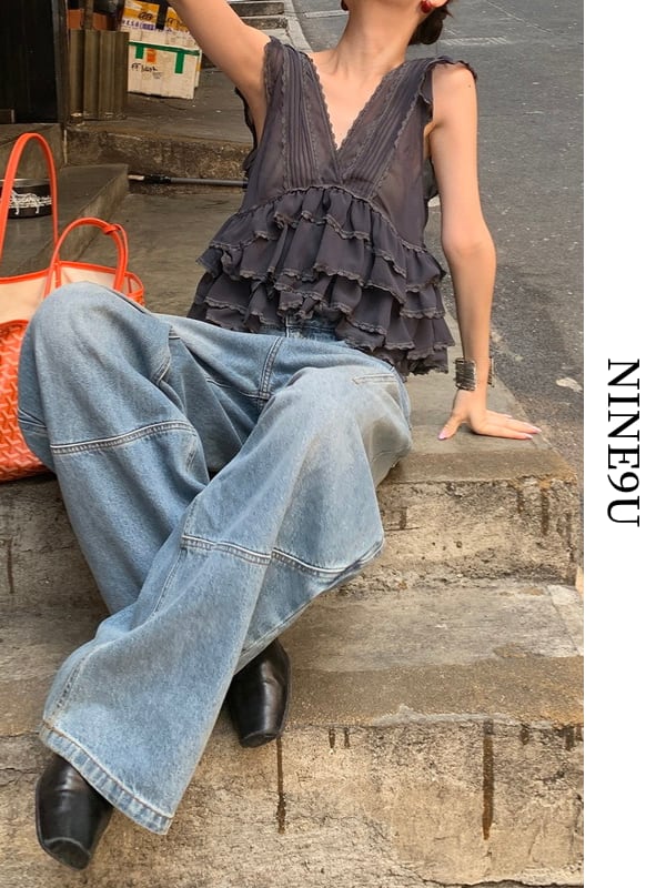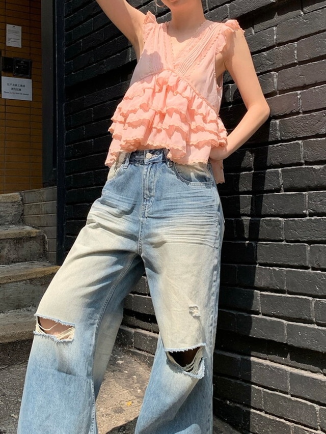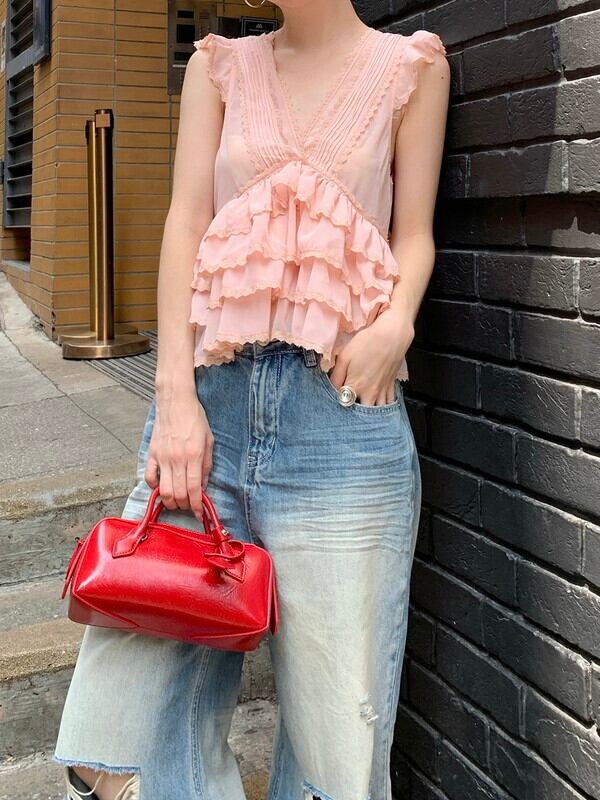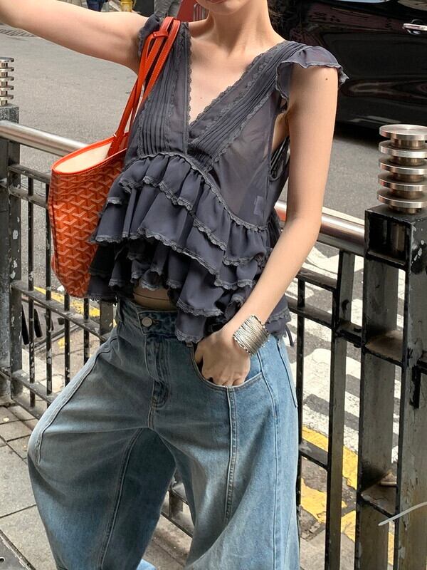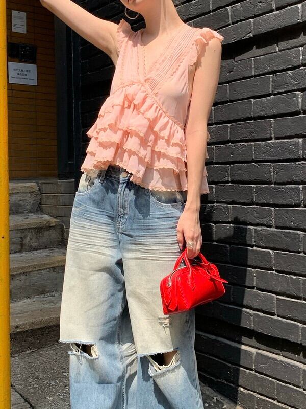 tiered cake sheer v-neck no-sleeve tops 3color【NINE9478】
