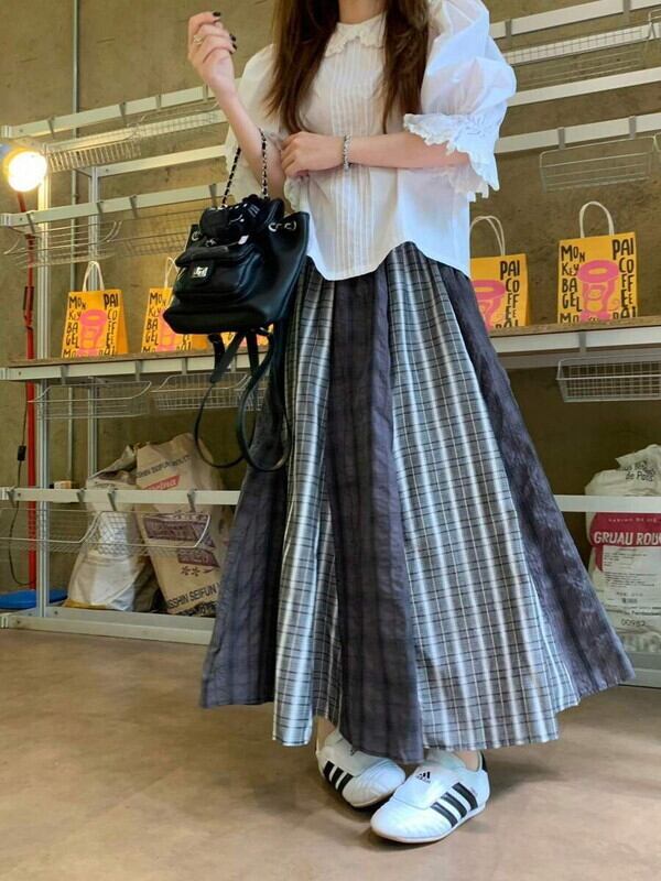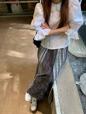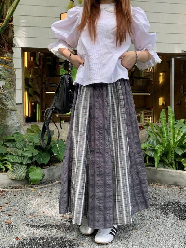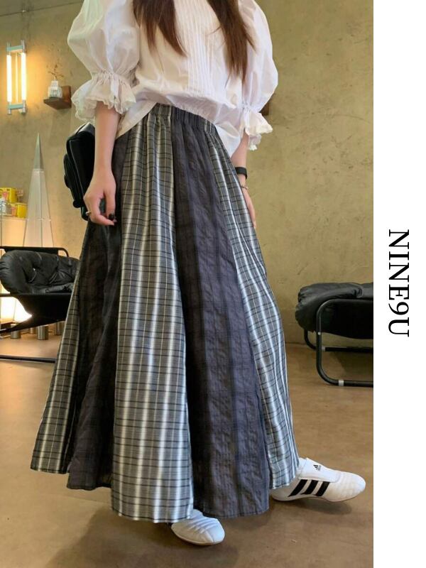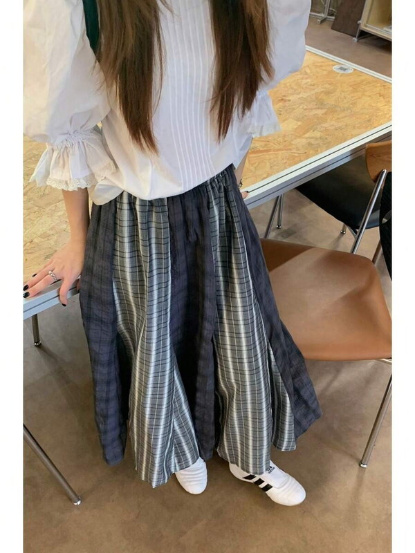 patchwork plaid crinkle long-skirt【NINE-S0013】