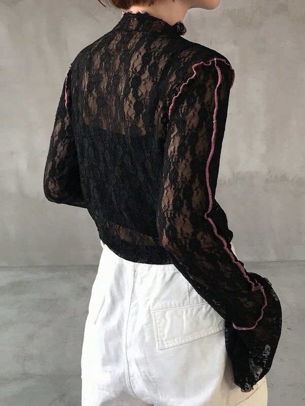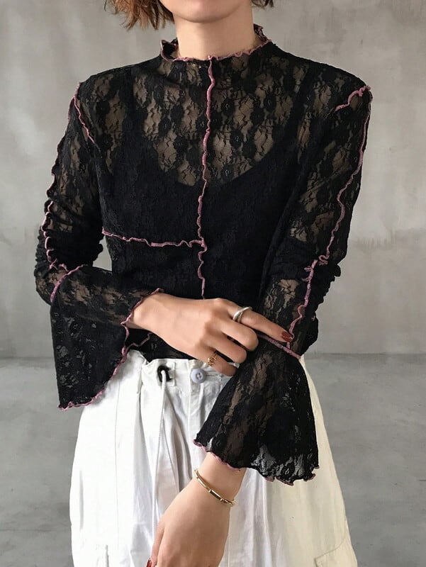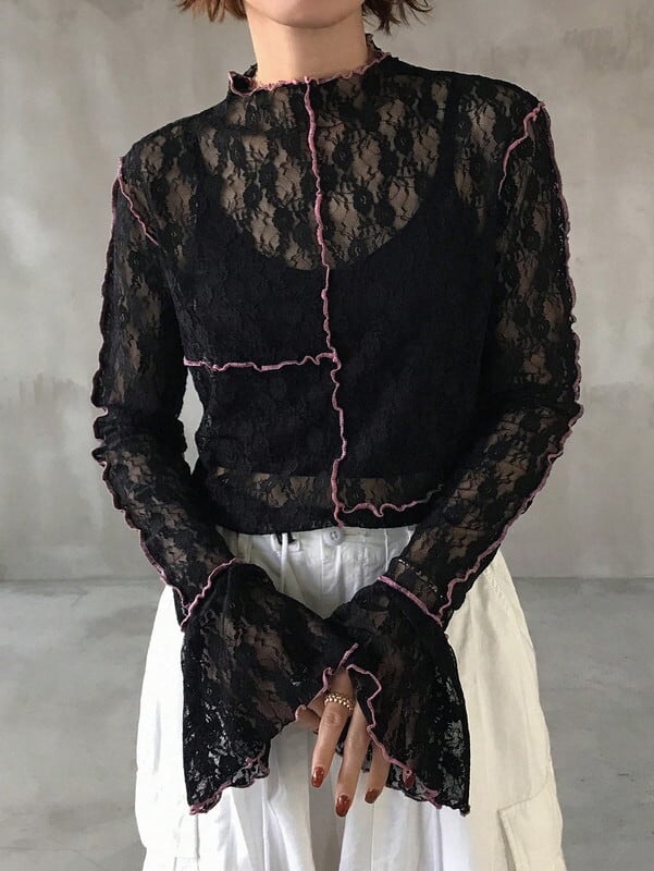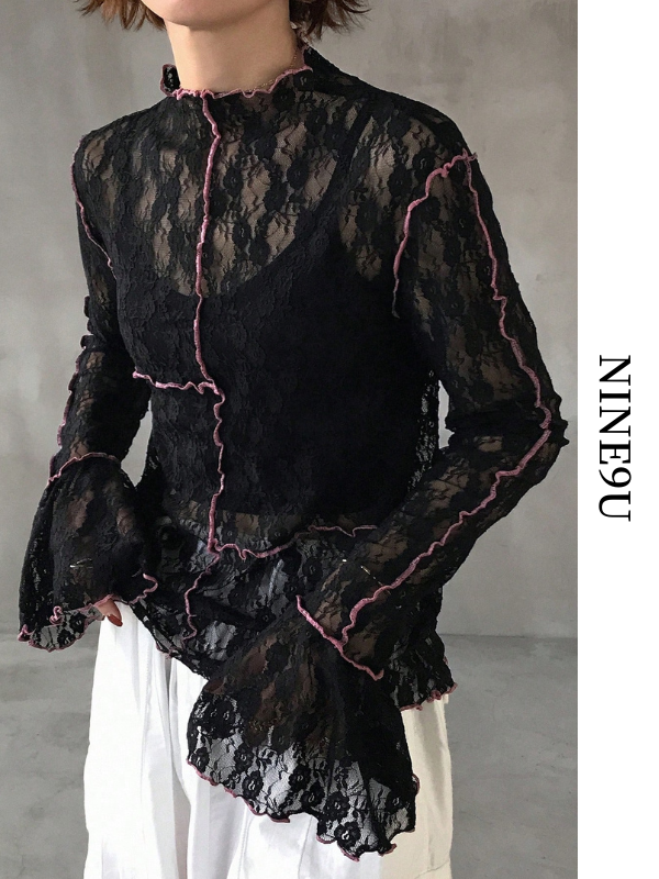flare-sleeve lace trim mellow tops【NINE-S0079】