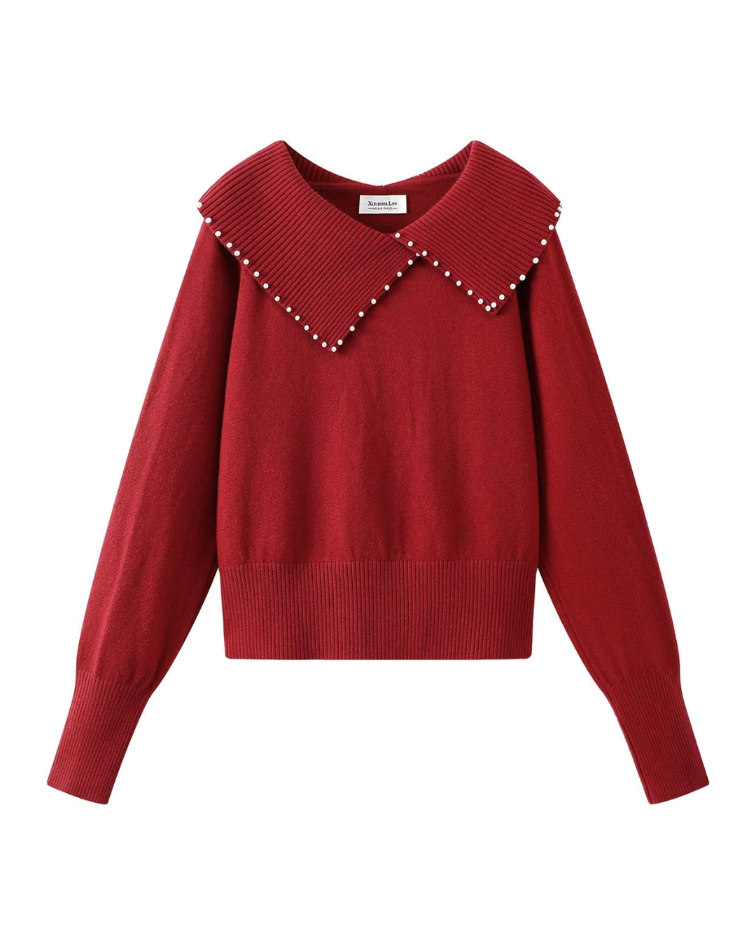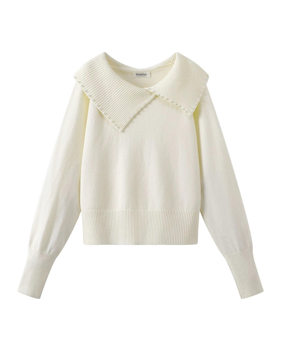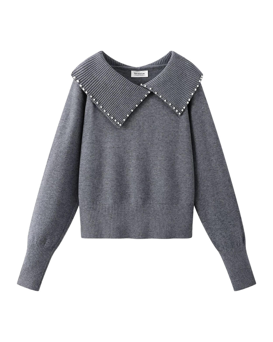 パール付きの襟が特徴的なニットセーターです。カジュアルなデザインながら、上品さも兼ね備えた一着で、ゆったりとしたシルエットが魅力のアイテムです。