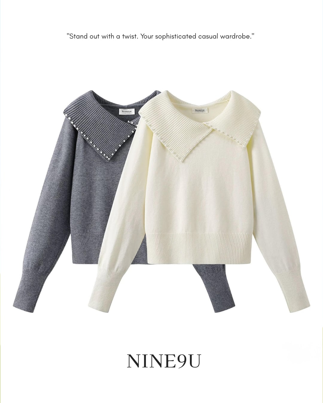 asymmetry collar pearl knit tops 3color【NINE0226】