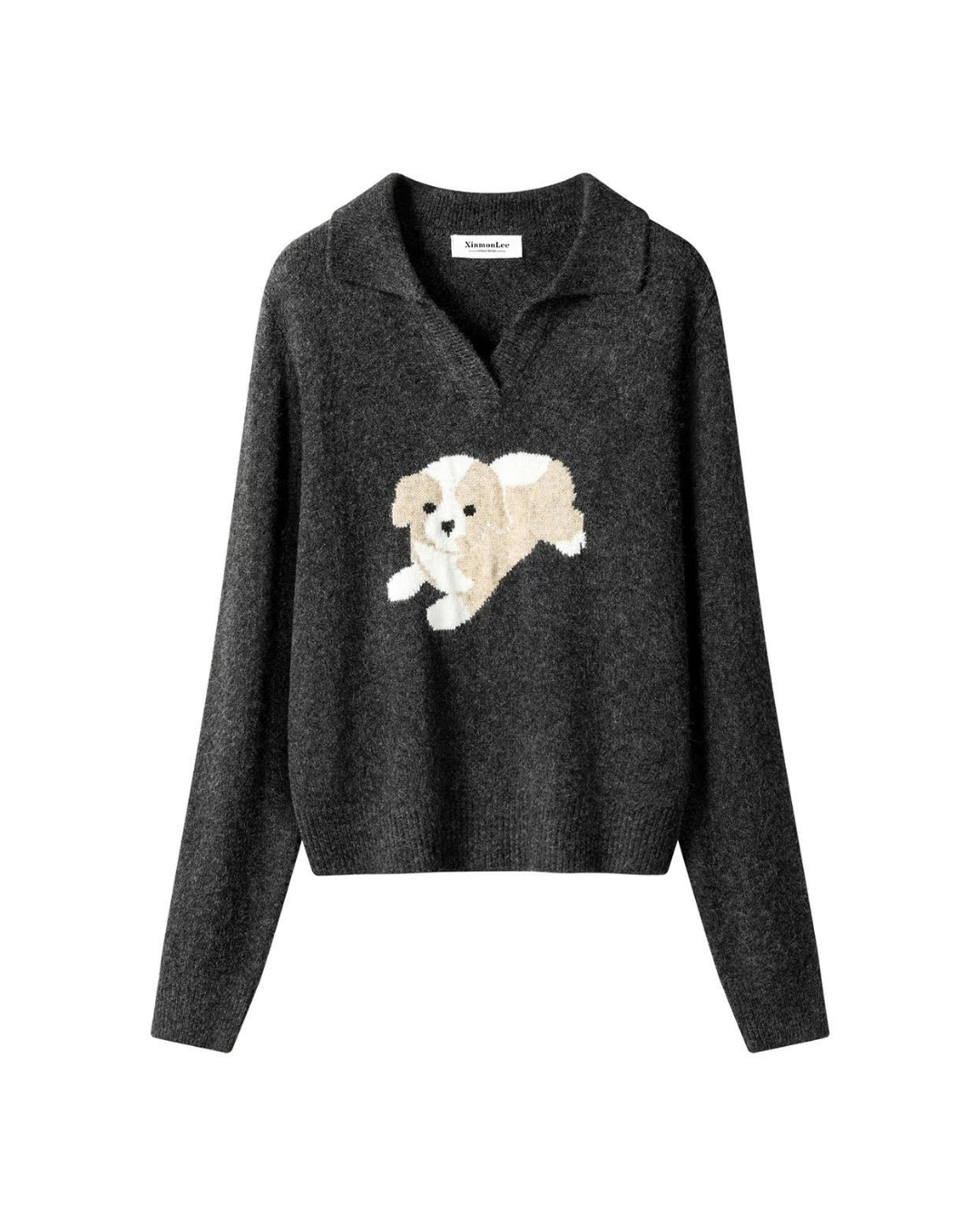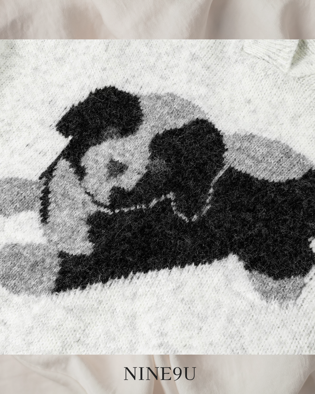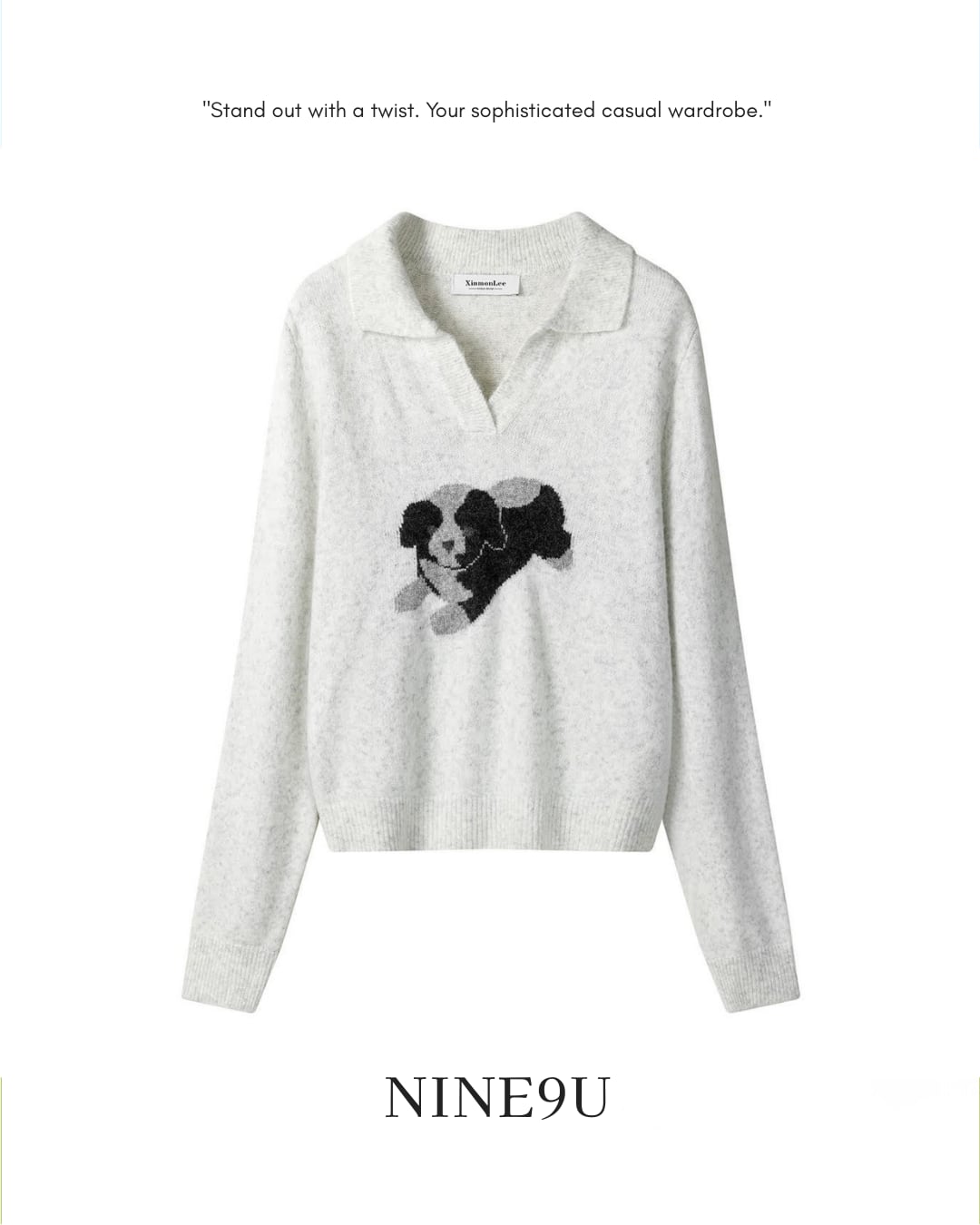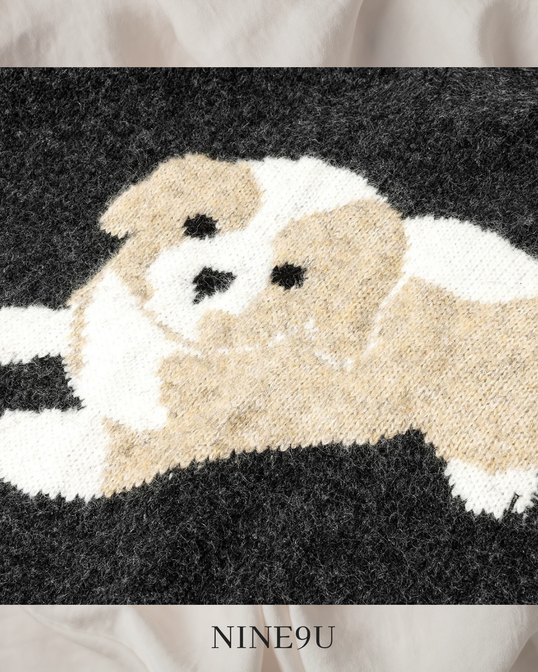 Vネックデザインが特徴のドッグプリントニットセーターです。カジュアルながらも個性的な印象を与えてくれる一着で、愛犬家や犬好きの方にぴったりのアイテムです。