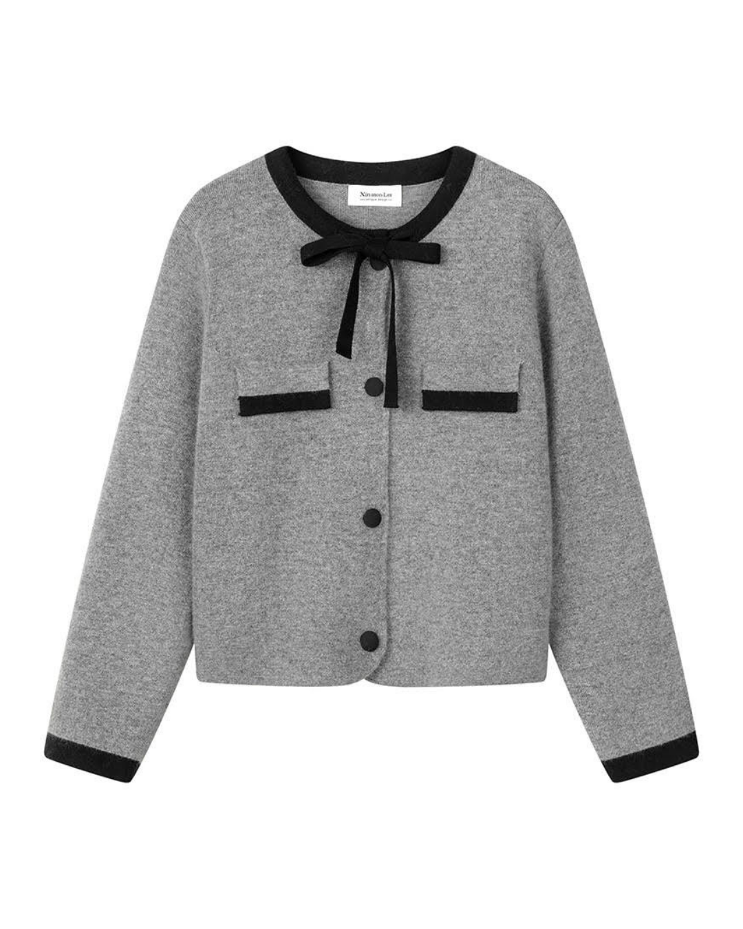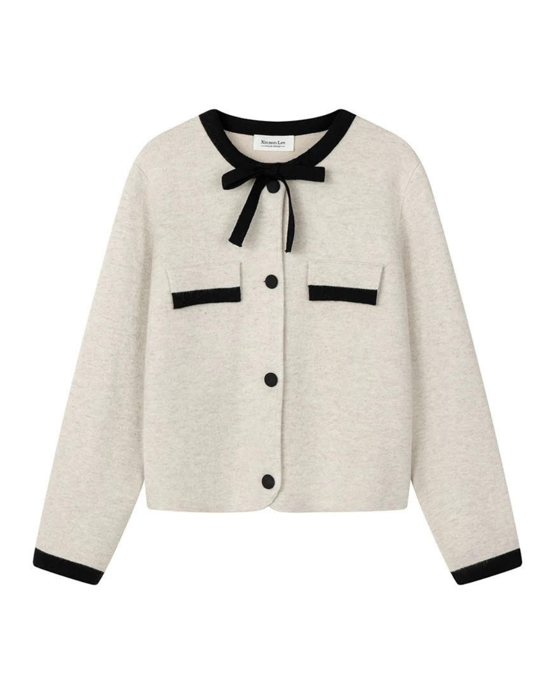 レトロなデザインが特徴的なリボン付きの前開きニットカーディガンです。暖かみのある素材感と、可愛らしいリボンがアクセントになっており、カジュアルシーンからお出かけまで幅広く活躍する一着です。