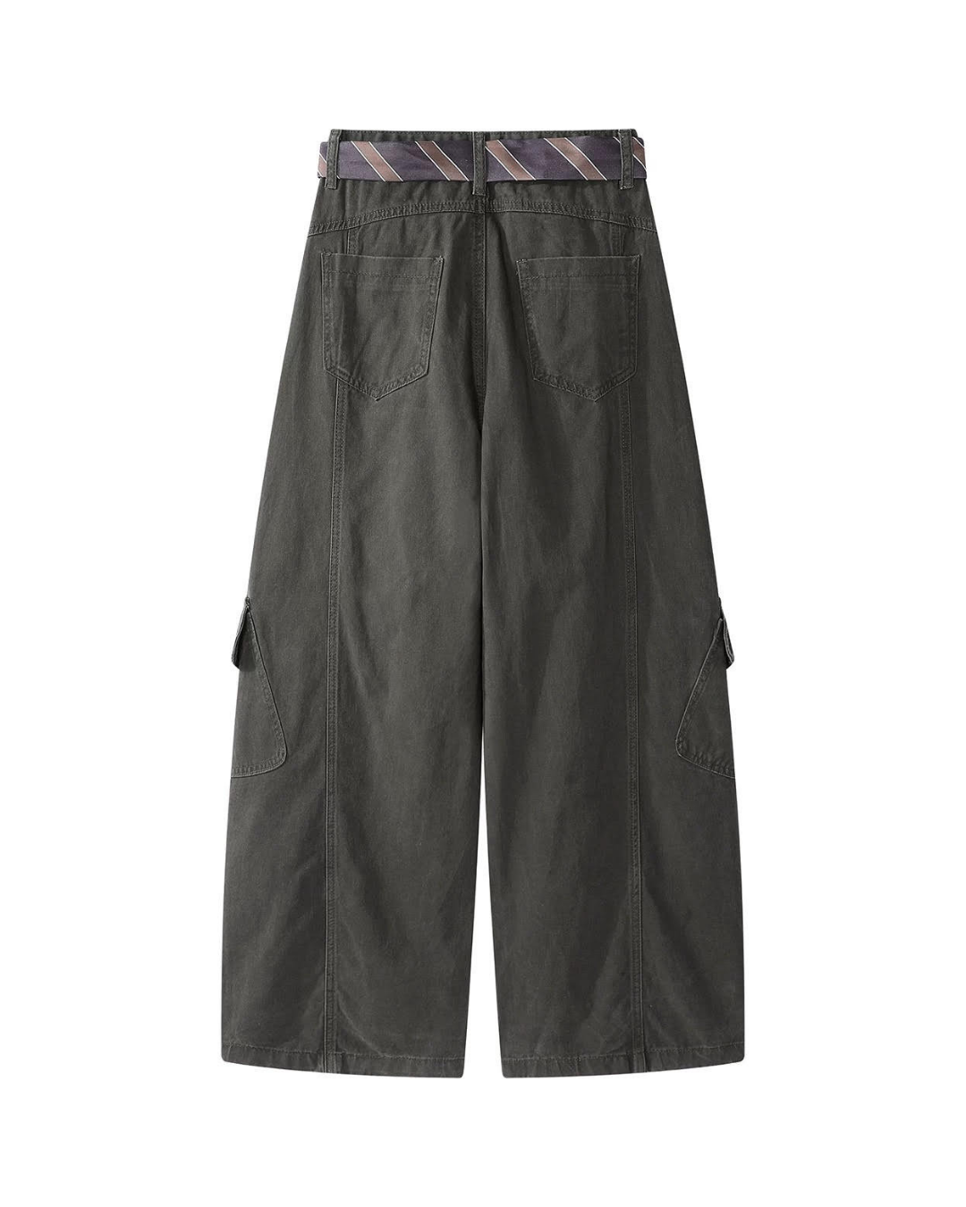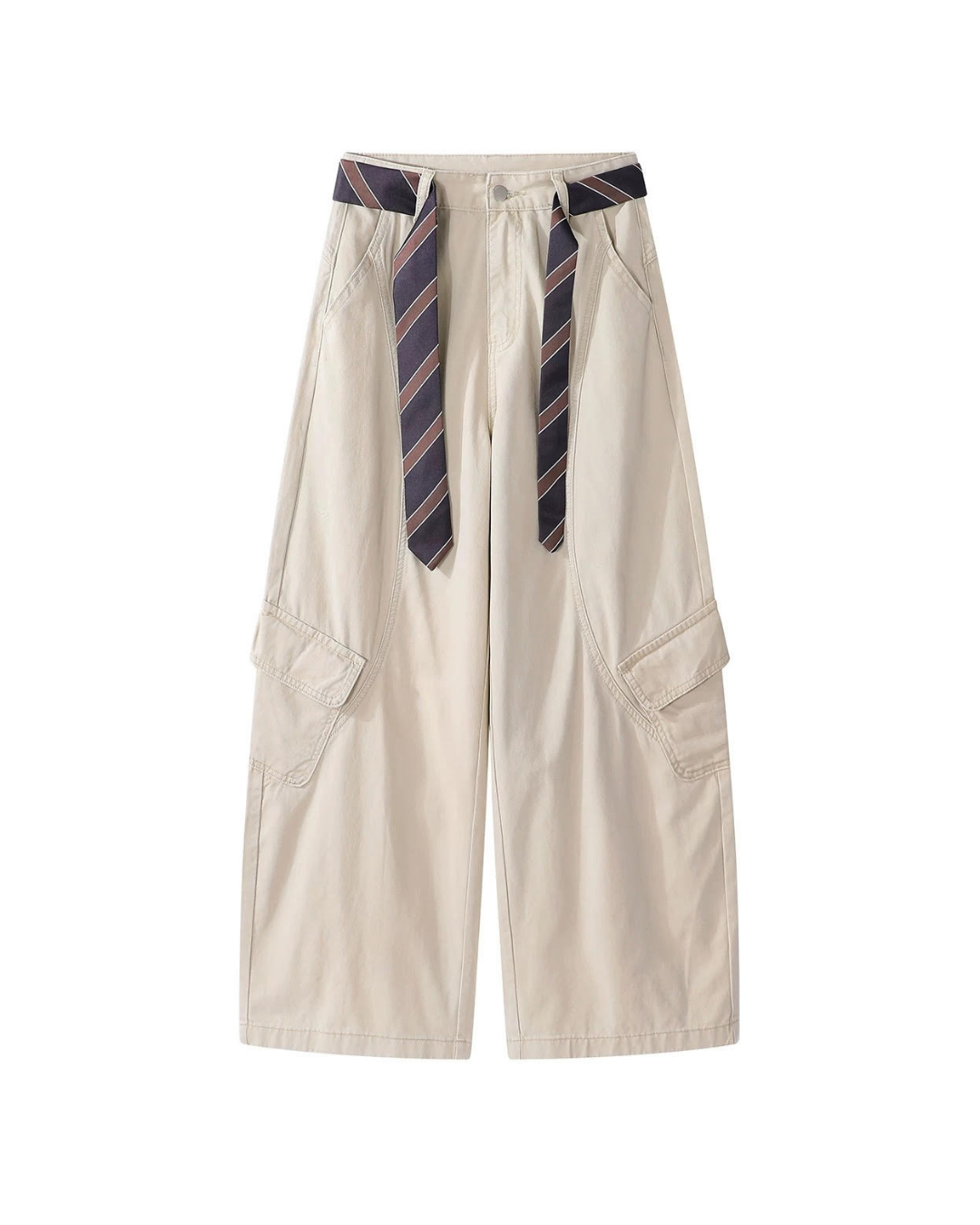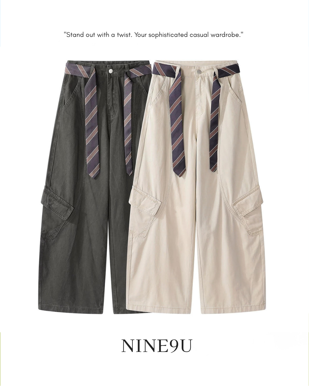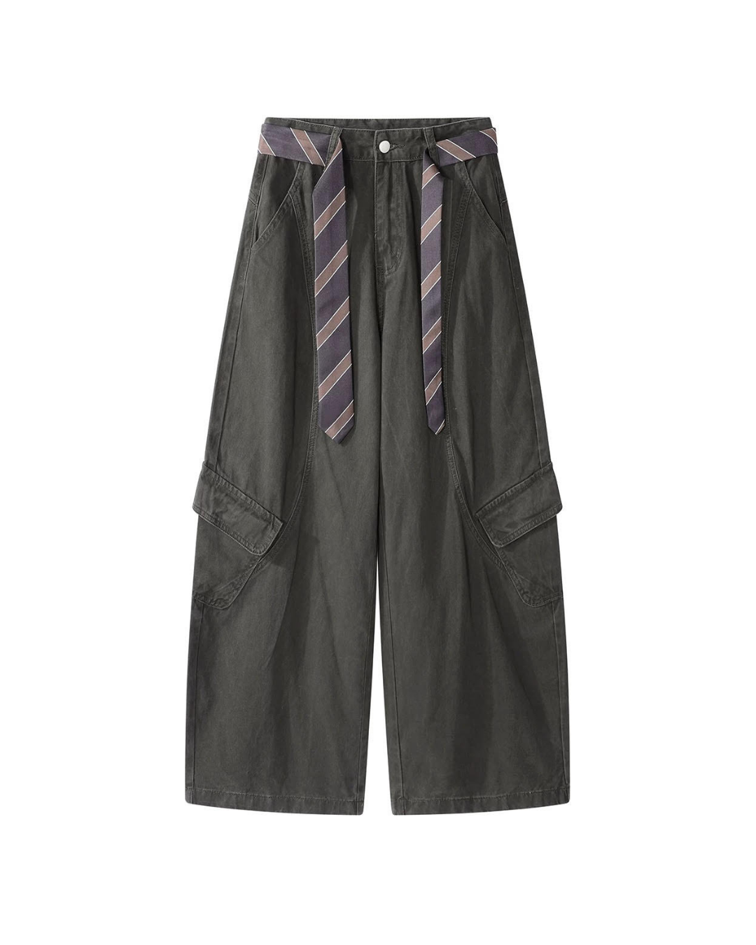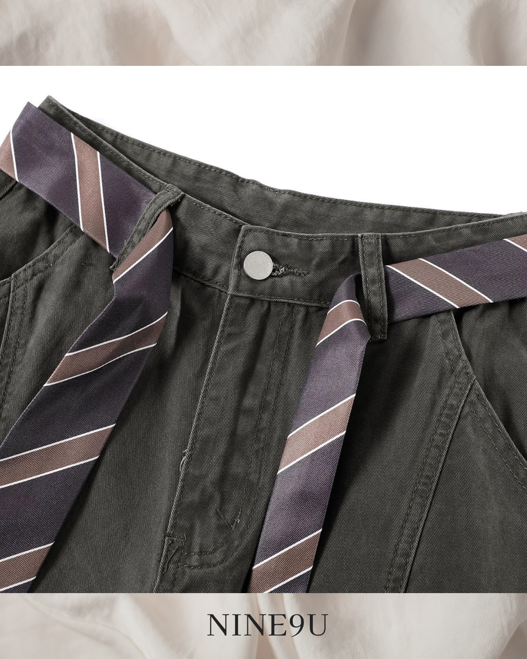 high waist belt tie cargo denim pants 2color【NINE0246】