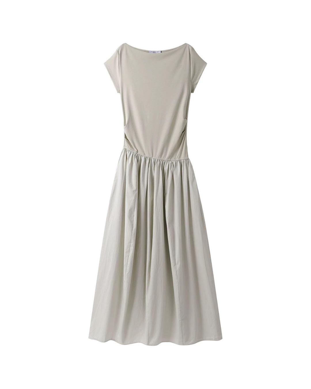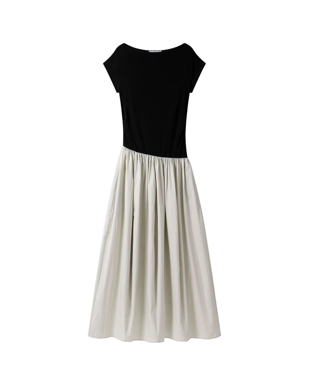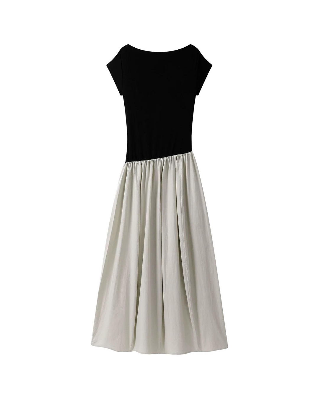 バイカラーのデザインが目を引くAラインロングワンピースです。スリムなシルエットと半袖スタイルが実現するフェミニンな印象は、デートやお出かけにもぴったりの一着です。
