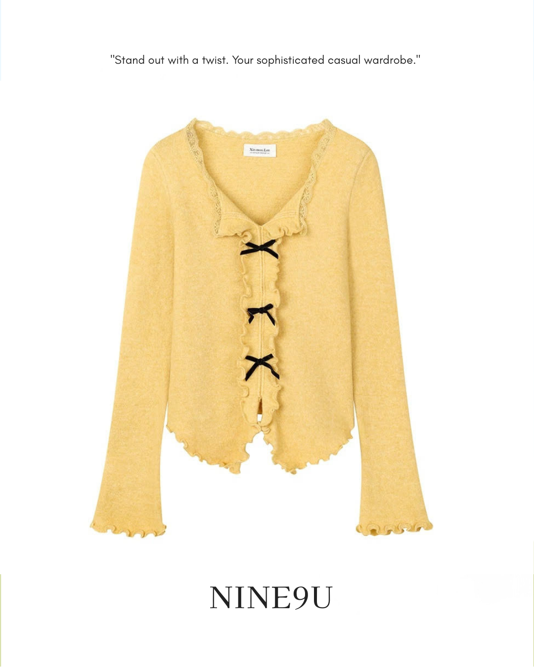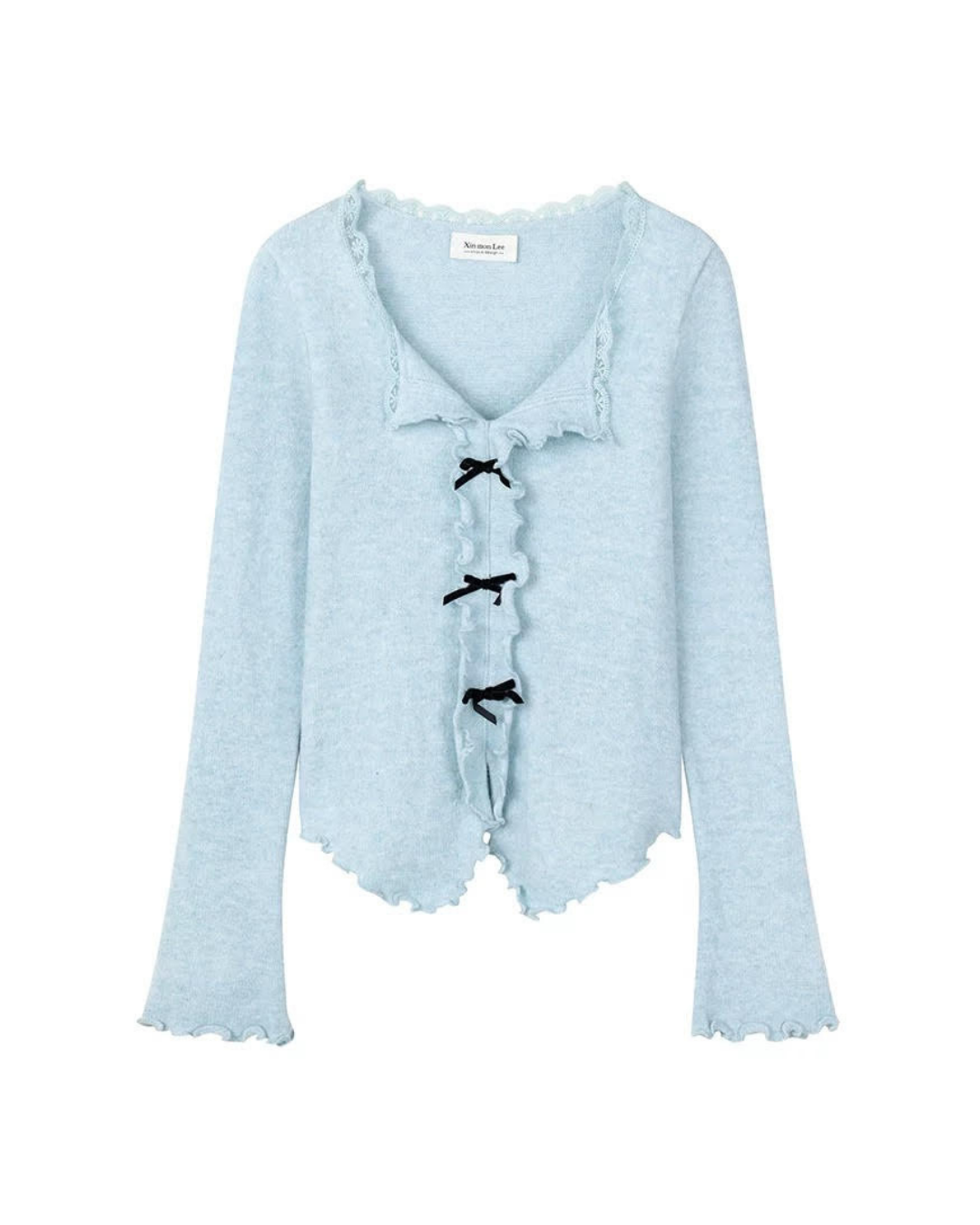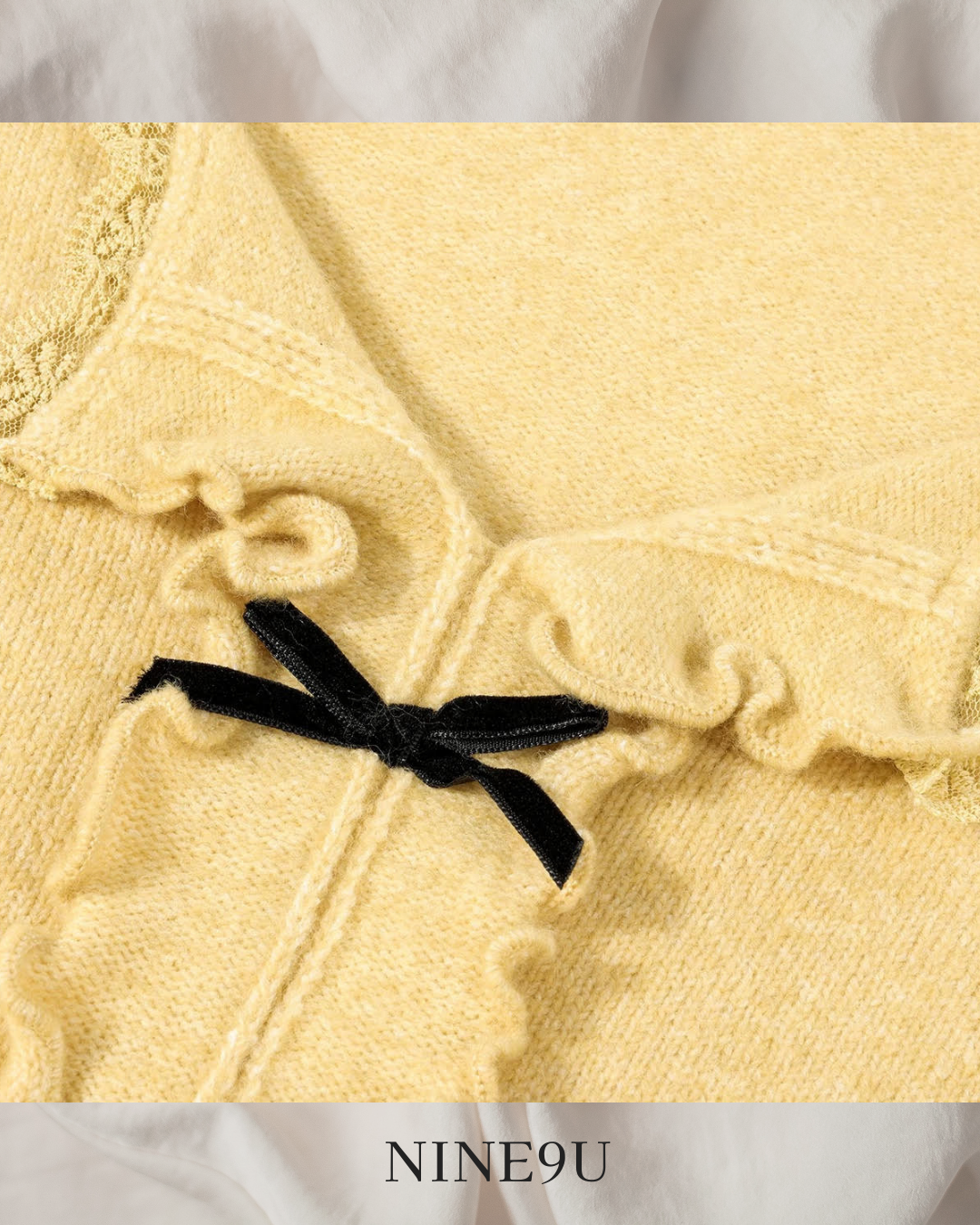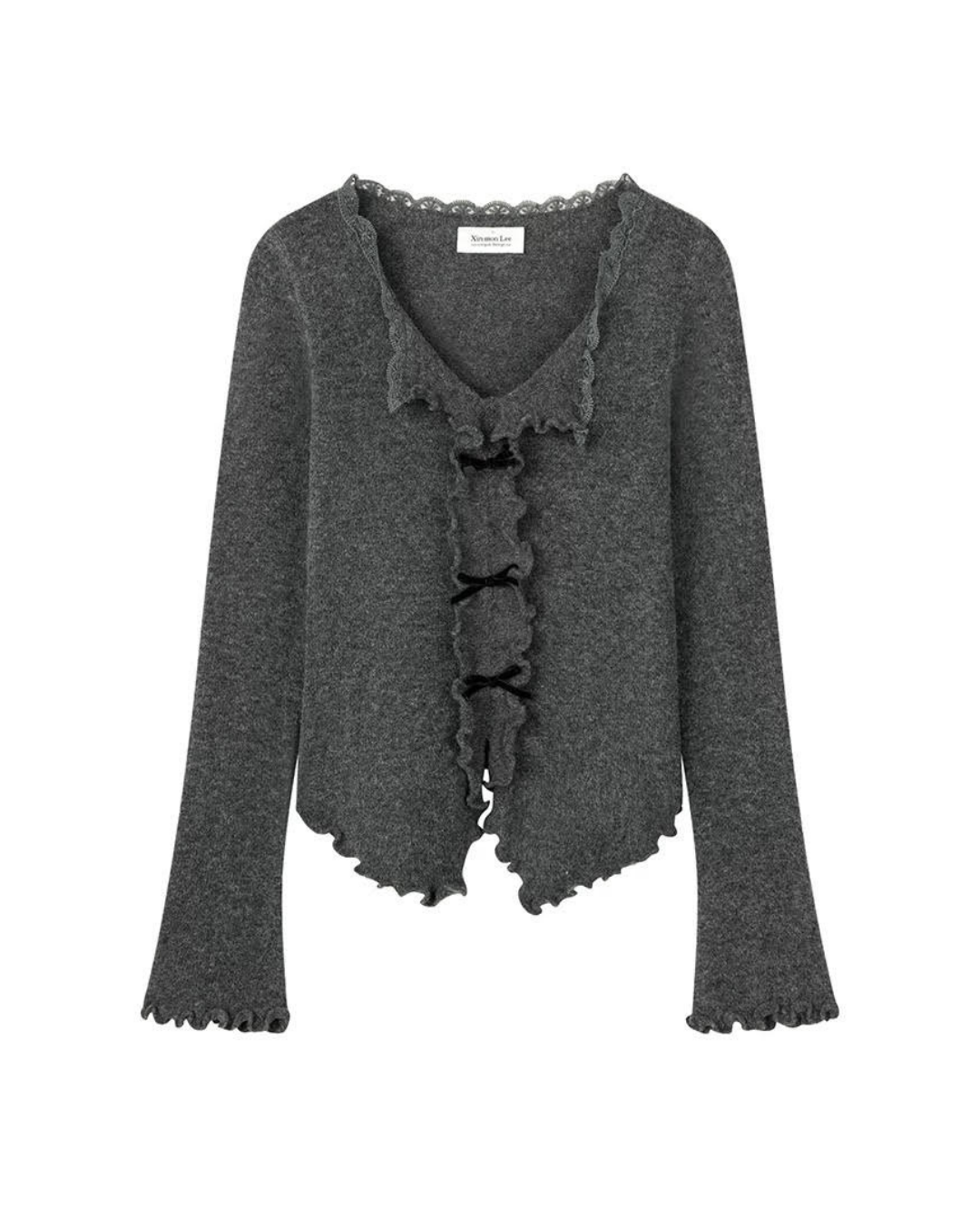 Vネックデザインとキュートなリボンとレースが特徴のロマンティックな長袖ニットです。フェミニンな印象を与えながらも、柔らかなニット素材が着心地を実現します。様々なシーンで活躍する一着で、デイリースタイルから特別な日のコーディネートまで幅広く活躍するアイテムです。