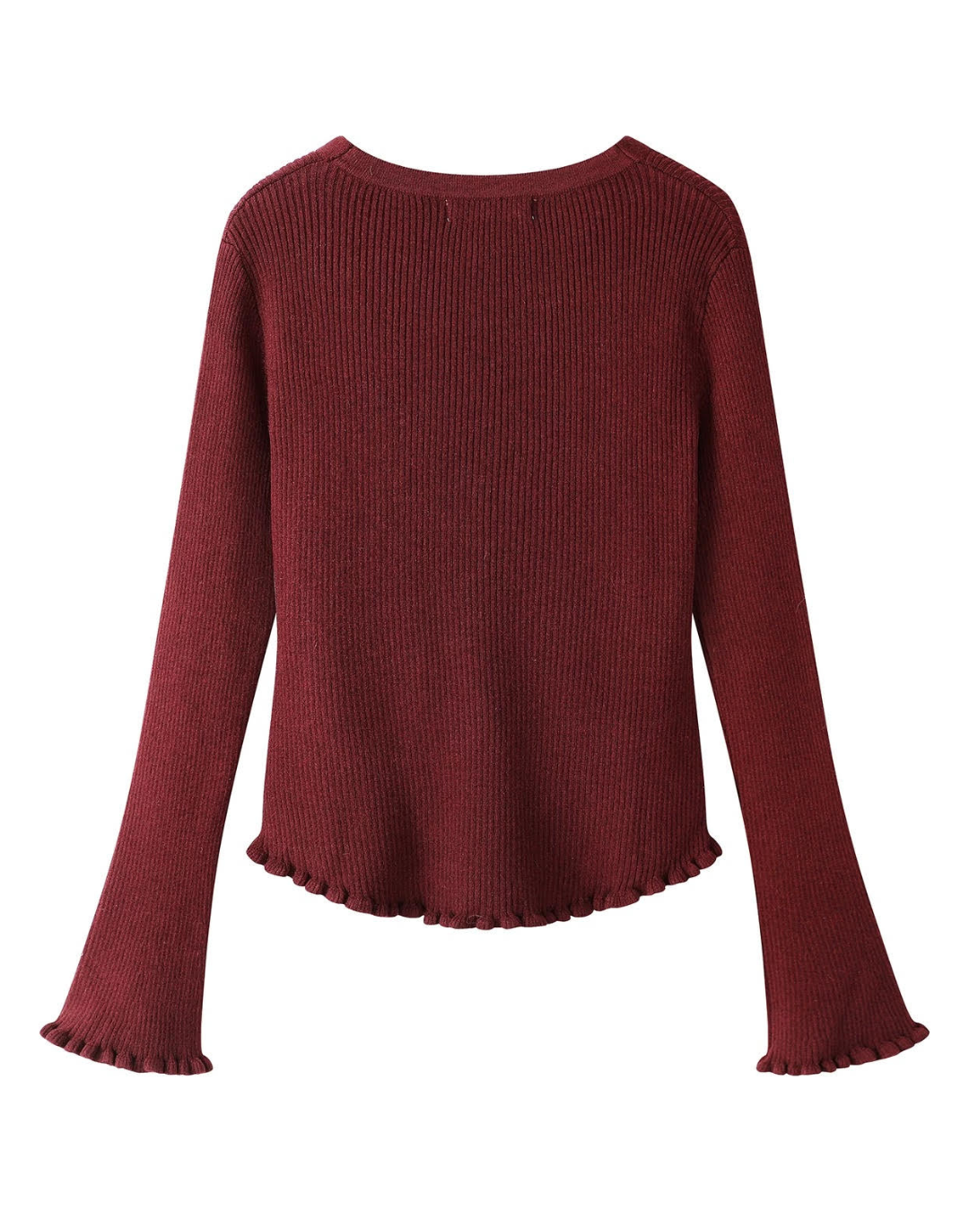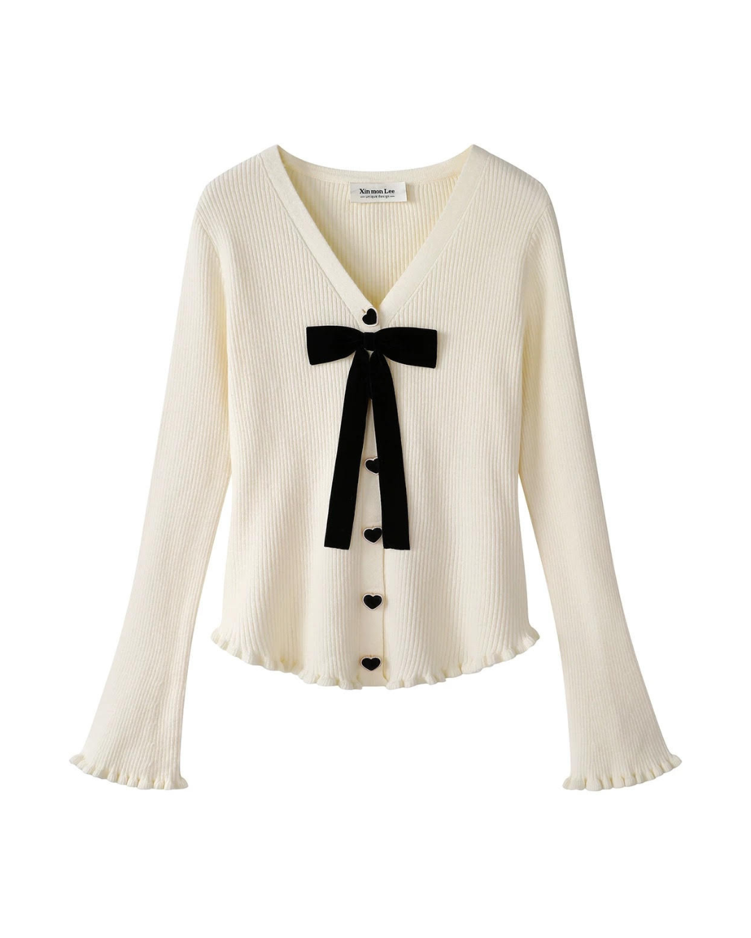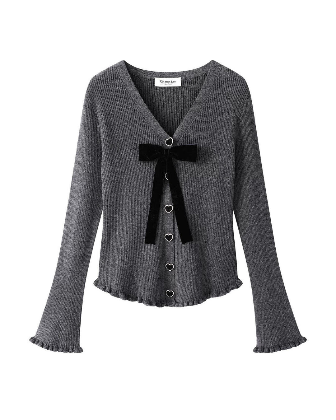 Vネックとハートボタンが可愛らしさを引き立てるリボン付きニットセーターです。長袖仕様で、肌寒い日にもぴったりのアイテム。シンプルながらも上品さを兼ね備え、カジュアルからお出かけスタイルまで幅広く活用できるデザインです。